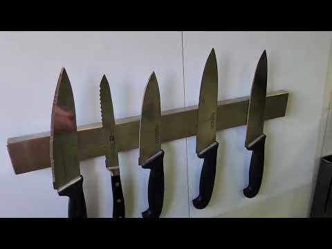 מתקן נירוסטה כסוף לתליית סכינים/כלים. אורך המוצר 46 ס"מ , כולל פתחי תליה לברגים בצד האחורי.